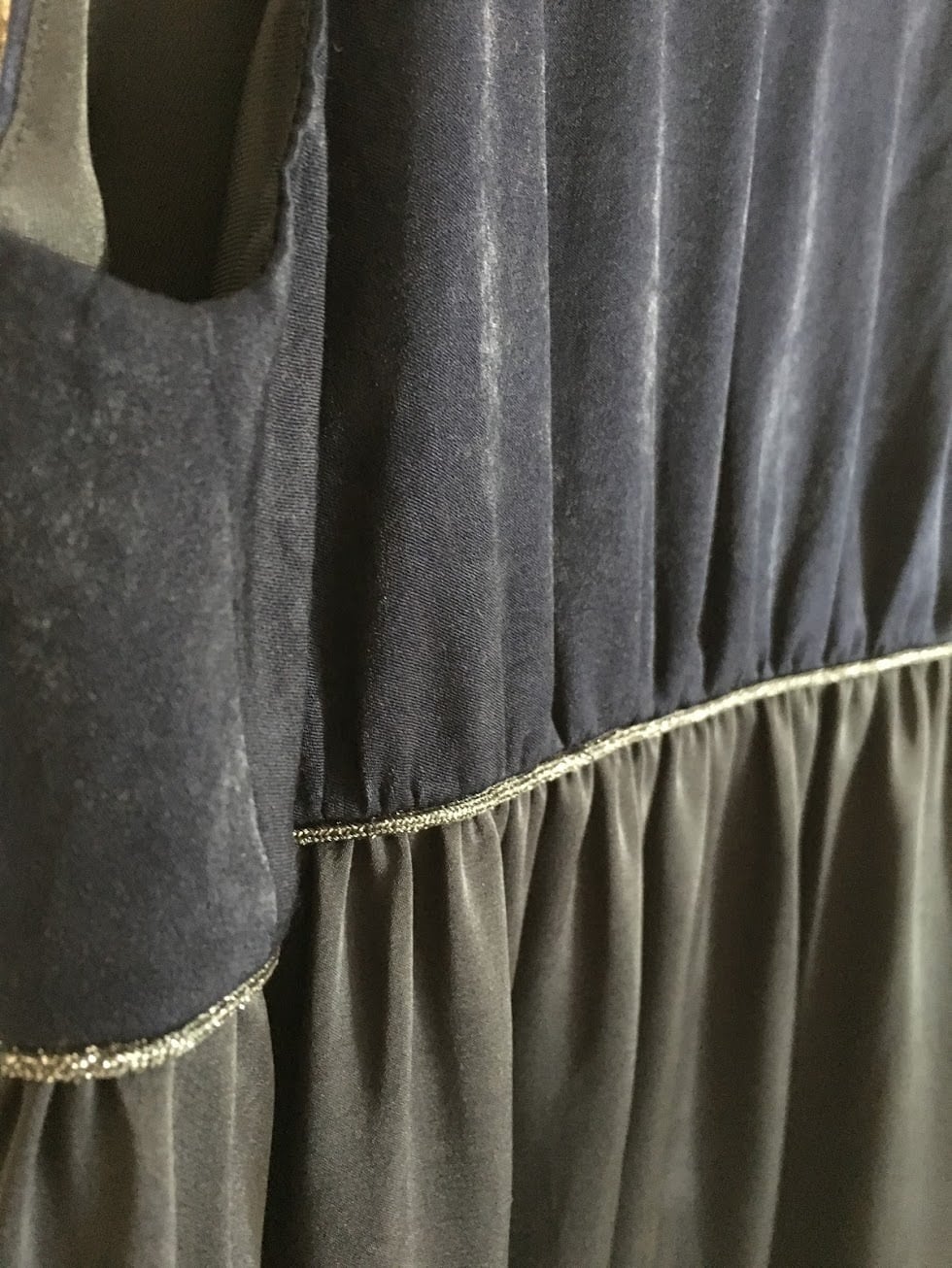 加工の異なるサテン2種で切り替えたギャザードレス。