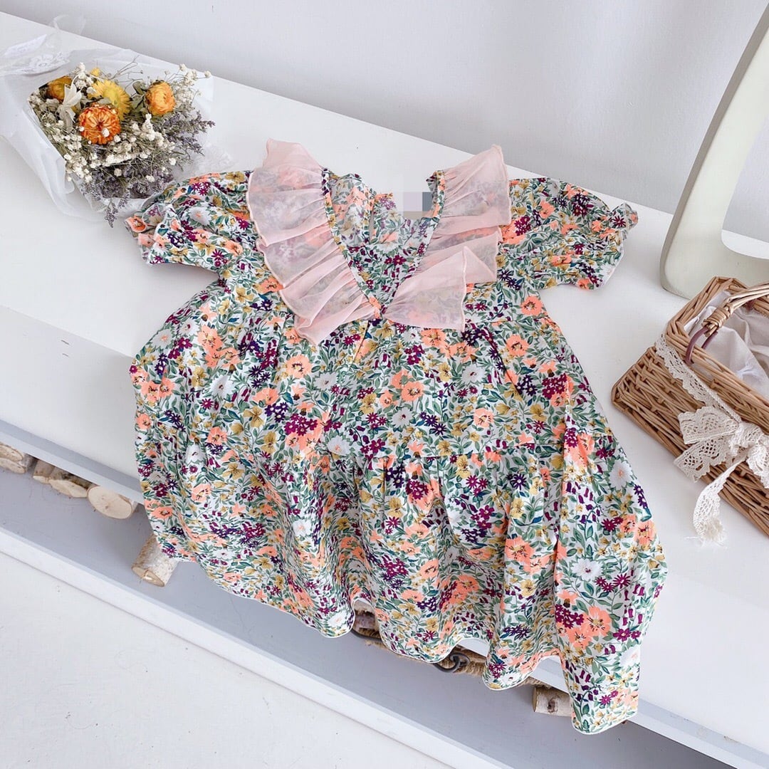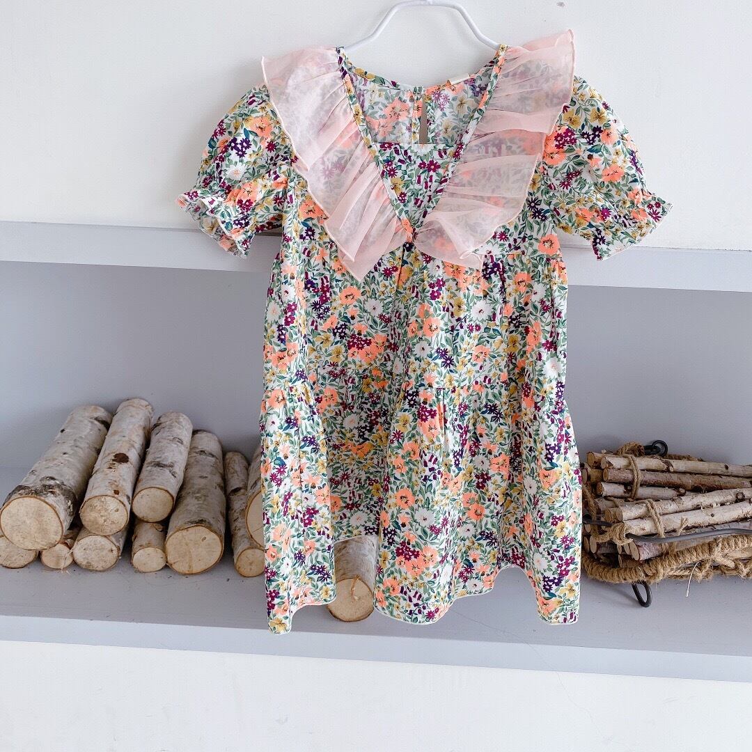 ワンピース 花柄 半袖 フリル チュール パフスリーブ フラワープリント パステルカラー 春 夏 子供服 子供 キッズ 女の子 女児 人気 おすすめ かわいい おしゃれ お出かけ 韓国 韓国子供服 誕生日 バースデー 小学生 プレゼント 贈り物 ギフト 1歳 2歳 3歳 4歳 5歳 6歳 7歳 8歳 90 100 110 120 130 140 150